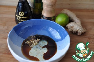 Делаем маринад из соевого соуса "Киккоман", сока лайма, оливкового масла (1 ст. ложка), тёртого корня имбиря, свежемолотой смеси перцев.