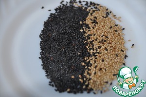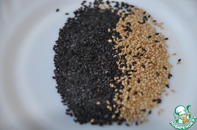 • Смешиваем в тарелке белый и чёрный кунжут.