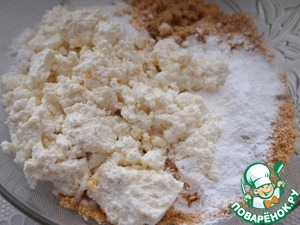 К песочной крошке добавить сахарную пудру и рикотту. Перемешать.