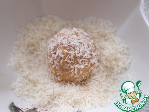 Затем каждый шарик хорошо обвалять в кокосовой стружке. Убрать в холодильник на 20-30 минут.