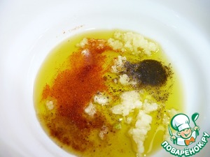 Готовим заливку для салата. В оливковое масло выдавить чеснок, добавить смесь перцев, соль, сахар, имбирь, мускатный орех.