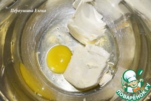 Разбить яйца в кастрюлю, положить размягченное масло.