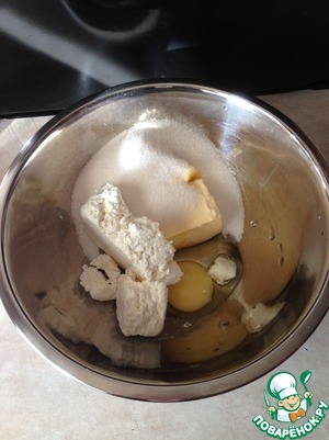 В отдельной миске размешайте маргарин или масло (100г) + творог (200-220г) + 1 стакан сахара (220г) + 1 яйцо + 0,5 ч. л. соды, гашеной в 1 ч. л. сметаны. Перемешайте (я просто ложкой мешала, без миксера или блендера)