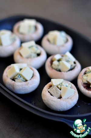 Нарезать горгонзолу и моцареллу небольшими кубиками, выложить на грибы. Солить не нужно.