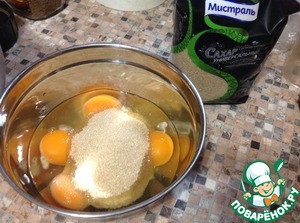 Яйца взбить с коричневым сахаром и ванилью до пены.