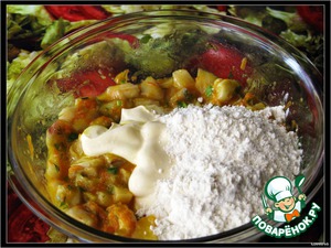 Всыпать муку и добавить майонез, все тщательно перемешать, посолить, по желанию добавить специи.