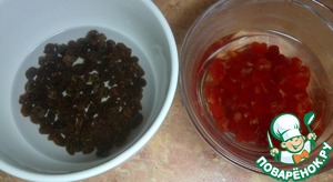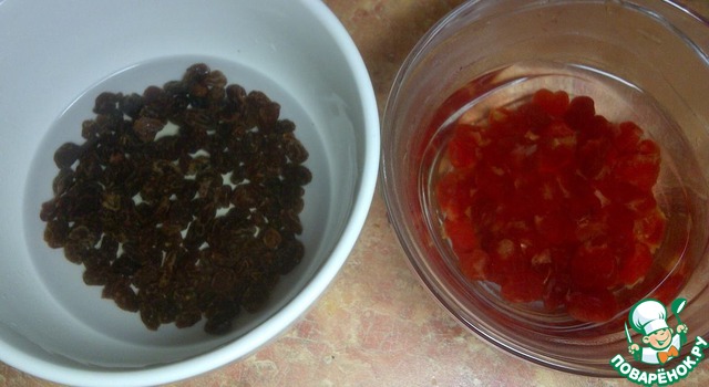Промыть и залить кипятком в разных чашах изюм и вишню. Оставить на 15 минут.