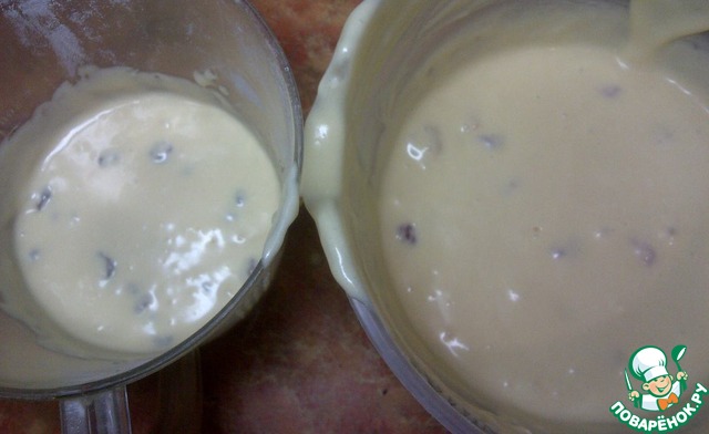 В одной ёмкости смешать тесто с запаренным и уже просушенным на салфетке изюмом, а в другой с обсушенной вишней.