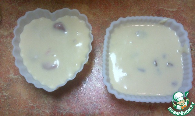Разлить по формочкам. В сердечках -с вишней, а в квадратных-с изюмом. (я заполняла формочки почти полностью. Сначала тесто поднялось, но при открытии духовки опало)Но на вкусе это не отразилось.