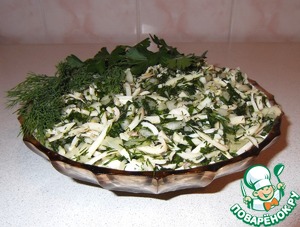 Покываем нашей начинкой, то есть кальмарами с зеленью и чесноком. Сверху ложим веточку укропа и петрушки