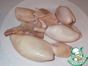 Кальмары очищаем и варим в подсоленой воде 5 минут
