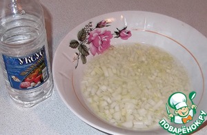 Лук нарезаем мелкими кубиками, заливаем кипятком и добавляем 2 столовые ложки уксуса. Оставляем минут на 10 в тарелке чтобы пропитался.