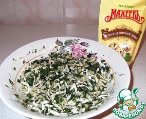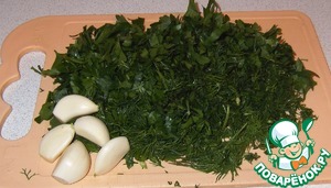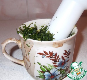 Чеснок пропускаем через чесночницу. Затем смешиваем его с мелконарезанной зеленью, добавляем соль, растительное масло, 1/2 чайной ложки красного жгучего перца и перемалываем в ступке ( или стакане ) толкушкой