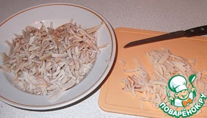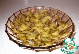 Ну а затем, нарезаем консервированный огурец так же соломкой, и укладываем в салатницу.