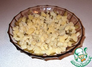 Далее отварной картофель режем кубиками и слоем покрываем наши огурчики.