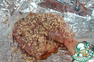 Грецкие орехи измельчаем. В фольгу кладем наш окорочок и посыпаем сверху половиной орехов. Заворачиваем фольгу и отправляем мясо на 30 минут в духовку разогретую до 190 гр., до готовности.