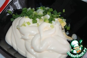Делаем заправку для салата. Для этого отвариваем яйца. Отделяем белки от желтков. В тарелку кладем желтки, разминаем их вилкой, добавляем майонез и немного зеленого лука. Перемешиваем.