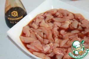 Филе курицы нарезаем полосками и заливаем соусом. Маринуем 30 минут.