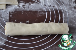 Сворачиваем пластинку теста с рыбой рулетиком.