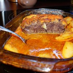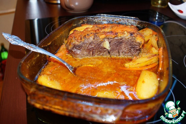 Люблю говядину, да только не часто делаю. Прочитала рецепт (рассылка). Всего под рукой не было, купила кусочек говядины, приготовила вчера. Правда помидоры заменила на домашнюю аджичку а вино на коньяк (ну не люблю я красное вино, а коньячок имелся в наличии, то же в чистом виде не употребляю, а вот утречко молотый кофе прогреть с коньяком, а уж потом сварить, это мое). Да и готовилась у меня грудинка дольше, до картошки часа 3.5 стояла, мы с сыном на базар ходили. Все долго. Но ваше участие в этом долгом процессе только в начале. Но какое тающее, нежнейшее получилось мясо, какой вкуснейшие картофель, а о моркови и говорить нечего, у меня не муж в первую очередь выбрал. Сын правда есть не стал, для него получилось наверное островато. Но взрослым очень понравилось.