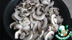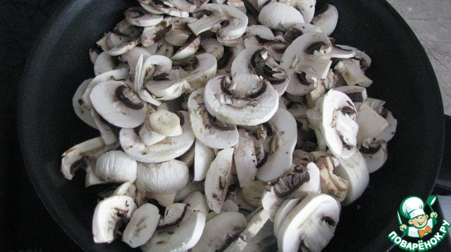 Обжарить очищенные и порезанные шампиньоны, если образуется жидкость, упарить.