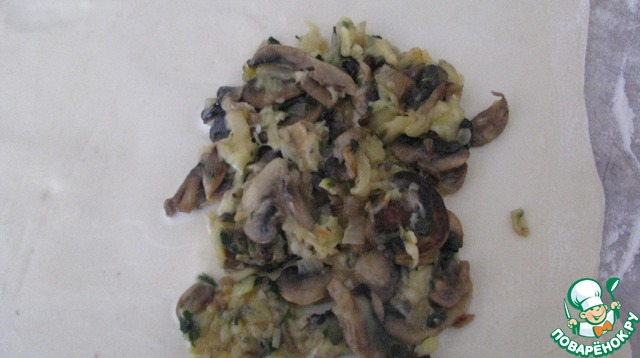 Раскатываем размороженное тесто, режем его на прямоугольники и на каждый кусочек теста выкладываем грибную начинку.
