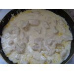 Снимаем сковороду с огня, добавляем сыр и желток, перемешиваем.