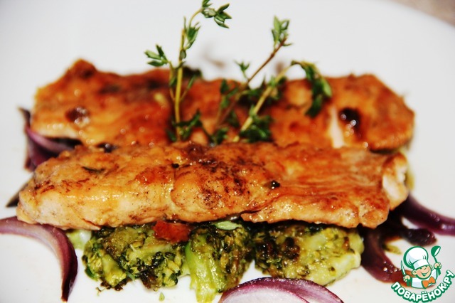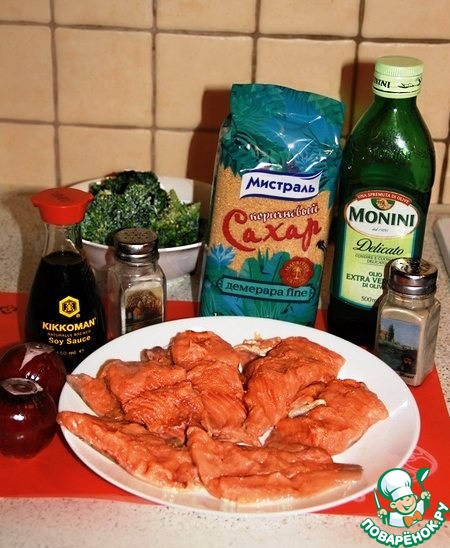 • На брокколи выложить готовую рыбку с жареным луком. Полить оставшимся соевым соусом глазурь. Украсить блюдо на свое усмотрение.