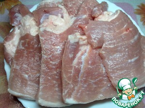 Мясо моем и промокаем салфетками. Режем свинину на куски. Отбивать свинину не нужно, поскольку мясо и так нежное, к тому же оно будет мариноваться несколько часов.
