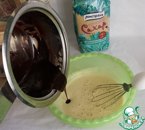 Духовку включить на разогрев до 200 градусов. Пока шоколад остывает, взбить в крепкую пену яйца с сахаром, добавить муку, перемешать.