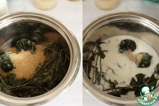 В сотейник или кастрюльку положить мяту, шпинат и сахар (у меня мята замороженная, поэтому такой вид), залить молоком. -