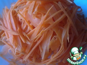 Огурцы очистить от кожуры и тоже натереть на корейской терке или просто нарезать тонкой соломкой.