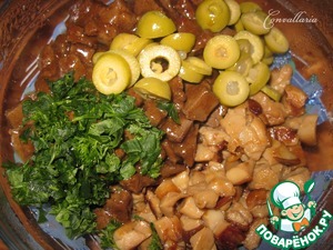 В глубокой емкости соединить грибы, печень, петрушку и оливки, нарезанные тонкими кольцами.