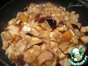 Лесные грибы (у меня белые) хорошо промыть и нарезать небольшими кусочками. В сковороде разогреть немного растительного масла, переложить грибы и тушить под закрытой крышкой 30 минут до полного испарения жидкости. Грибы остудить.