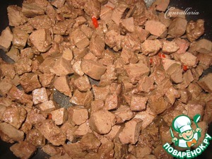 Говяжью печень хорошо промыть, нарезать маленькими кубиками. В сковороде разогреть 2 ст. л. растительного масла, переложить печень и жарить 5 минут на сильном огне, при этом часто помешивая. Добавить мелко нарезанный перец чили (без семян).