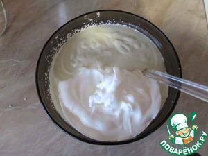 Смешать в миске взбитые сливки, белки и желтки