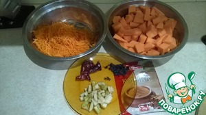 Тыкву, морковь почистить, вымыть. Тыкву нарезать кубиками, морковь натереть на средней терке или натереть с помощью кухонного комбайна. Грушу нарезать небольшими кубиками.