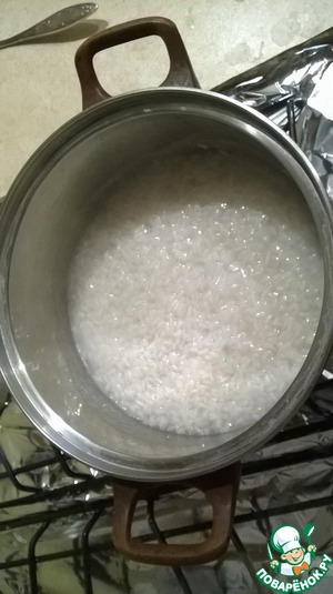 Рис промыть в проточной воде (я сливаю воду 10 раз) до тех пор, пока вода не станет прозрачной, и поставить варить на слабом огне в небольшом объеме подсоленной воды до полуготовности.