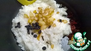 Переложить в кастрюлю достаточной емкости полуготовый рис. Добавить к нему, не сливая масла, кусочки обжаренной груши. Положить кусочки сушеного сладкого перца, кизил, 2 бутончика гвоздики.
