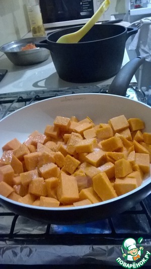 В масло, оставшееся от жарки груш, положить кусочки тыквы и тушить их до полуготовности. Добавить во время тушения в тыкву сахар. Когда тыква дойдет до нужной степени готовности - переложите ее в кастрюлю к рису. Масло не сливайте.