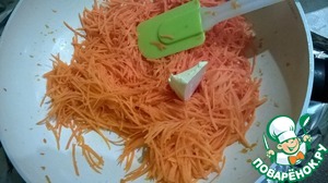 В оставшееся от жарки груши и тыквы масло положите тертую морковь. Если Вы используете свежий сладкий перец - самое время добавить его на сковородку). Подсолнечного масла к этому моменту на сковороде будет немного. Поэтому самое время добавить сливочное масло. небольшой брусочек. И снова отправляем все в кастрюлю с рисом и тыквой.