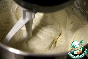 В другой посуде смешиваем сахар, творожный сыр и масло и хорошо перемешиваем миксером на высокой скорости.