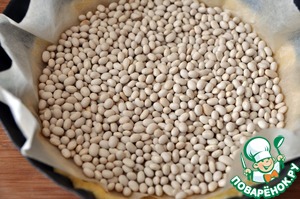 Сверху теста кладём пекарскую бумагу, насыпаем фасоль, чтобы тесто не пузырилось во время выпечки. Ставим в нагретую до 180 градусов духовку и выпекаем основу 15-20 минут.