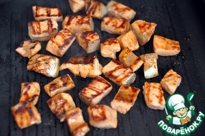 На сковороде-гриль поджариваем лосось по 1 минуте с каждой стороны.