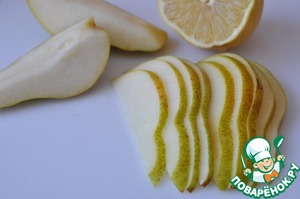 Берём спелую, сочную грушу (но не переспелую), удаляем сердцевину, режем тонкими пластинками, сбрызгиваем соком лимона.