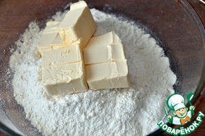 В миску просеиваем муку, добавляем соль, холодное сливочное масло, нарезанное кусочками.