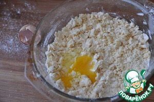 Перетираем муку с маслом руками в жирную крошку, добавляем холодное яйцо и замешиваем мягкое эластичное тесто.