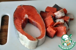 Берём лосось (у меня кижуч), удаляем кости, кожу, режем кубиками.