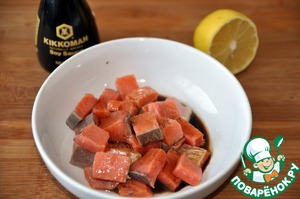 Сбрызгиваем лосось соком лимона и заливаем соевым соусом "Киккоман", отставляем мариноваться 15 минут.