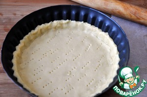 Достаём "отдохнувшее" тесто. Берём удобную форму для выпечки. У меня 22 см, из этого количества я делала 2 киша. Раскатываем тесто в круг диаметром больше формы и толщиной около 5 мм. Кладём тесто в форму, делаем бортики. Накалываем тесто вилкой.
